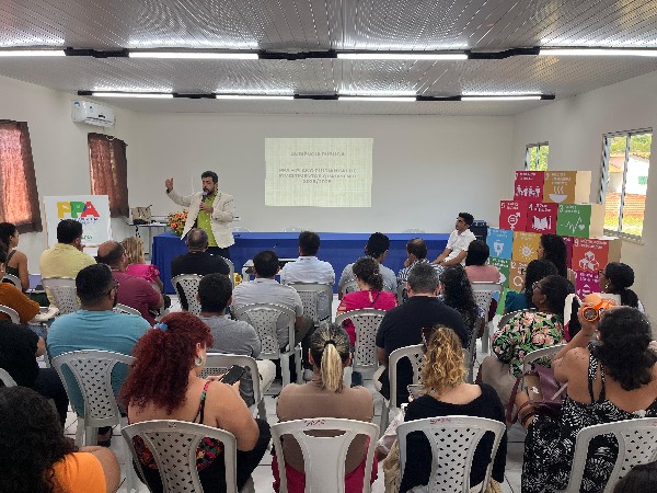Gabriela Ramires, da ONG Aquasis, apresentou os objetivos do desenvolvimento sustentável (ODS), uma agenda global estabelecida pela Organização das Nações Unidas (ONU) com objetivos e metas que orientam governos, empresas e sociedade civil a trabalhar juntos pelo desenvolvimento.