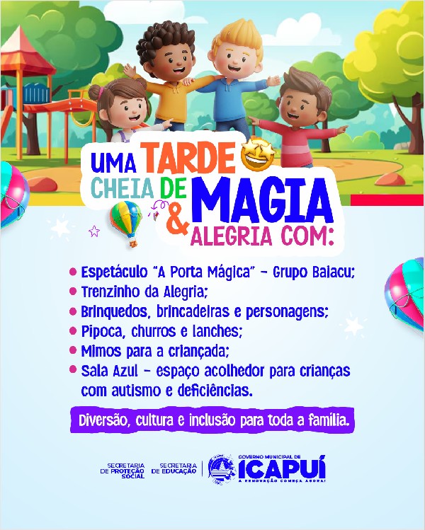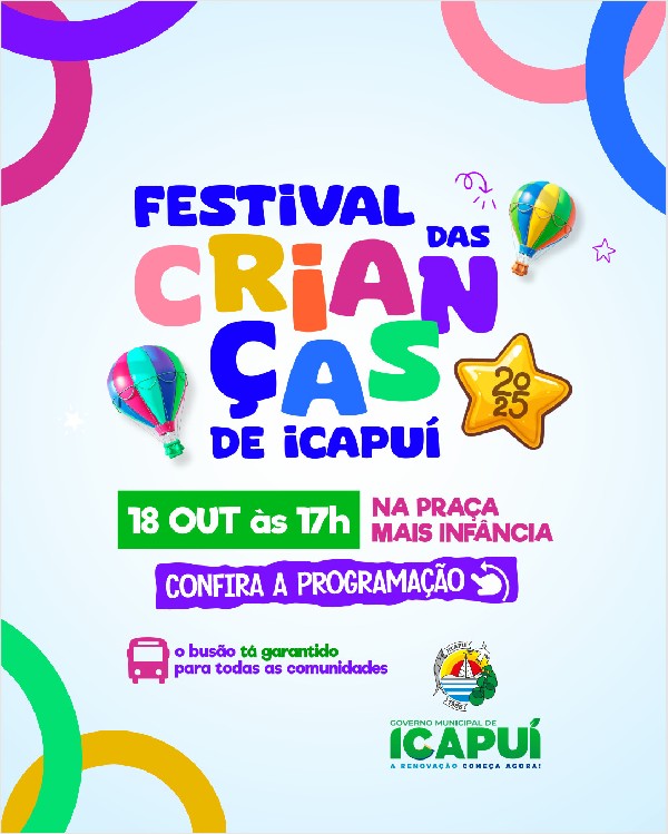 Em alusão ao Dia das Crianças, a Prefeitura de Icapuí realiza, neste sábado (18), o Festival das Crianças, a partir das 17h, na Praça Mais Infância, no centro. A ação promete um momento com muita alegria, brincadeiras, atividades lúdicas e momentos especiais para toda a família.
