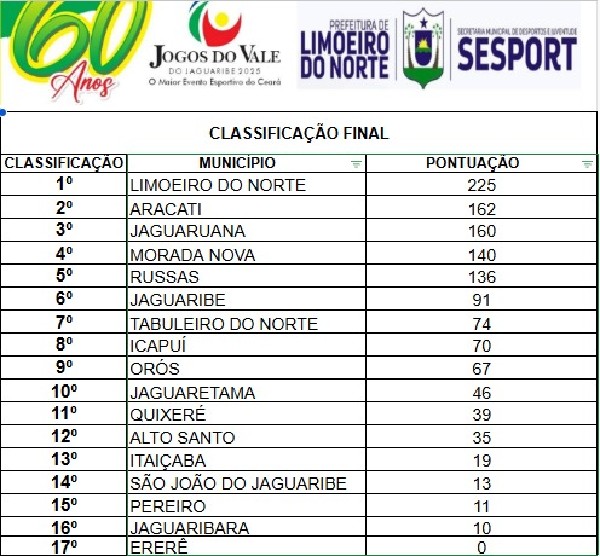 O desempenho do município nos Jogos do Vale do Jaguaribe reforça o compromisso com o incentivo ao esporte e à formação de atletas, celebrando mais um importante capítulo no desenvolvimento esportivo do município.