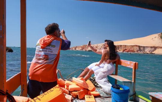 O passeio é realizado em pequenas embarcações que levam os visitantes até piscinas naturais e formações rochosas em alto mar (grutas).